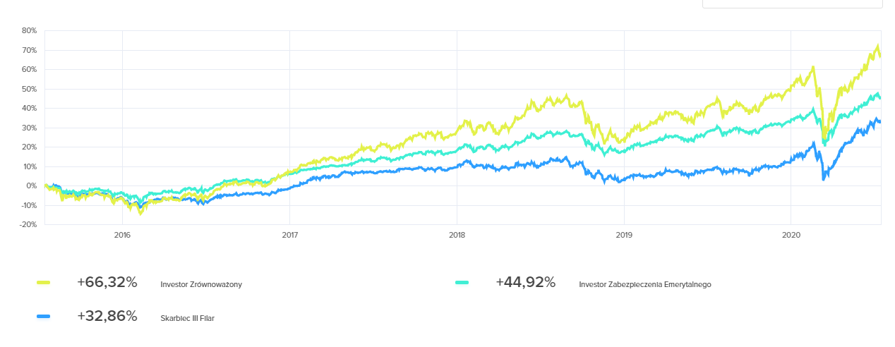 Jak widać, fundusz Skarbca idzie niemal płasko w latach 2018-2019, konkurenci pokonują go w tym okresie. Fundusze wyraźnie reprezentują inny poziom ryzyka, co uwidacznia tegoroczny kryzys. Z powyższych najbardziej podoba mi się wykres Investor Zabezpieczenia Emerytalnego - ograniczył spadek w pandemii, a i tak uzyskał niezły wynik. Właściwie każde większe załamanie tych funduszy było okazją do kupna, by uzyskać nieprzeciętny wynik.