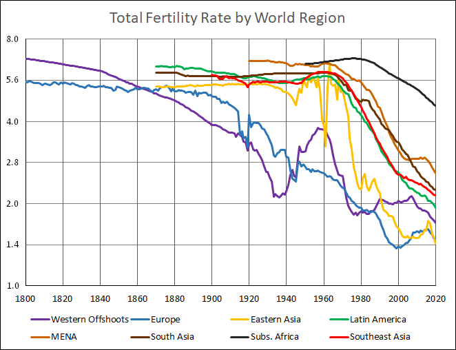 Praktycznie w całym świecie obserwowany jest spadek współczynnika płodności - TFR (Total Fertility Rate). O ile z początku spadek ten nie powodował zachwiania przyrostu demograficznego, a do tego wydłużanie średniej życia postepował, problem nie był specjalnie zauważany. Jednak wraz z wejściem w obszar poniżej zastępowalności pokoleń i utrzymywaniem się wieloletniego trendu mozna spodziewać się depopulacji. Jedynym kontytentem, który ma szansę jeszcze obronić się przez niskim TFR jest Afryka.