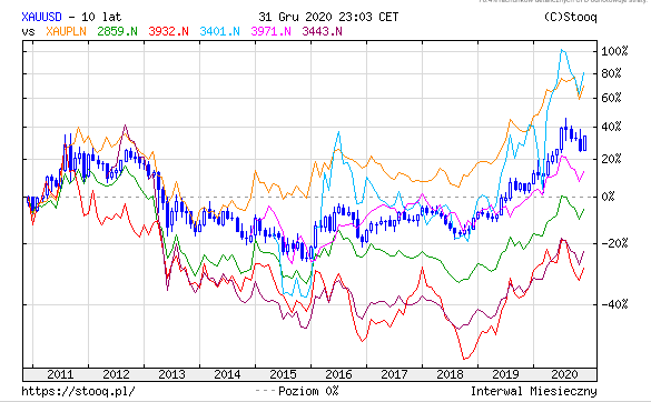 W okresie 10 lat kurs wyrażony w dolarach (świecowy) ulegał wahaniom, zauważalny jest lekki trend w dół, zbieranie sił w latach 2016-2018 i wybicie. Złoto nie jest więc kruszcem, który tylko drożeje, choć ceny u jubilera mogą dawać inne wrażenie. Co ciekawe, zmiana ceny w złotówkach (pomarańczowa) w krótszych terminach (60M, 24M) była zbliżona do tej dolarowej. Skoro kurs złota ulegał wahaniom, spadkom, czy strategia kup-i-trzymaj jest w pełni uzasadniona? Na to każdy musi sobie odpowiedzieć sam.