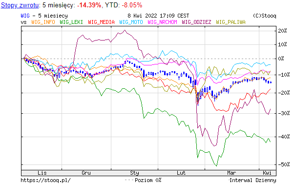 Euforia na spółkach z Ukrainy, gdzie uzasadnienia można szukać w dzielnym podejściu do agresora. Odzież i chemia także latała dość wysoko, choć zmienność na odzieży jest większa. Pięło się powoli WIG-Info i media, sporo pozostałych wskaźników płasko i z taką jakąś nieśmiałością sunie albo wręcz opada. Słabiej wygląda górnictwo, energia. Czyżby hossa na surowcach dała się tu we znaki?