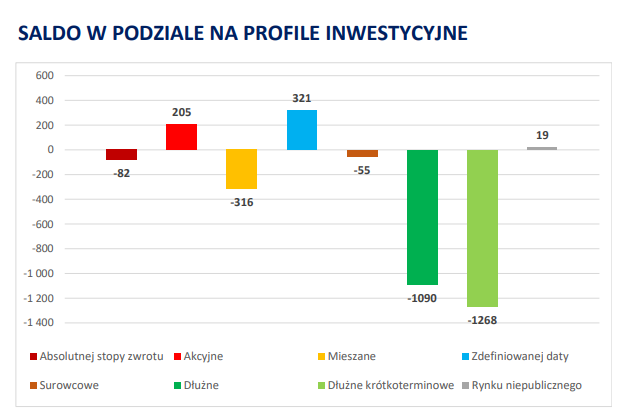 Większość funduszy dłużnych notowała zarówno spadki, jak i umorzenia. Widać też ucieczkę z funduszy technologicznych za sprawą dużych spadków giełdy amerykańskiej. Kwoty po stronie spadków znacznie wyższe.