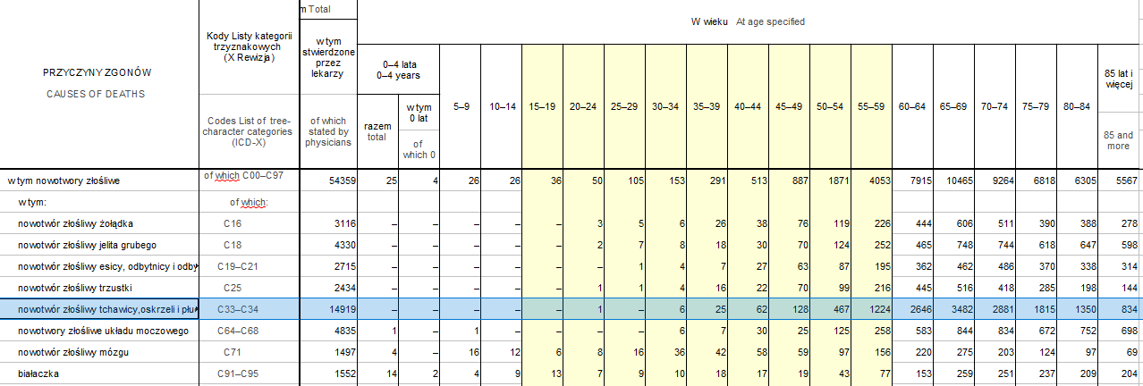 Nie ma ich w PDF rocznika statystycznego, ale odnalazłem je w dodatkowych plikach XLS towarzyszących rocznikowi na stronach GUS. Grupę wiekową 15-60 oznaczyłem żółtym tłem. Potwierdziły się wcześniejsze spostrzeżenia: dominujące przyczyny zgonów panów w młodym wieku to tzw. przyczyny zewnętrzne. Do danych GUS dodałem wiersz z procentowym udziałem zgonów w całości zgonów mężczyzn, który siega tu - uwaga - 70%. Najliczniejsze są wypadki komunikacyjne i samobójstwa. I tak to można wyjaśnić przyczyny przewagi zgonów panów do czterdziestki (!!!)