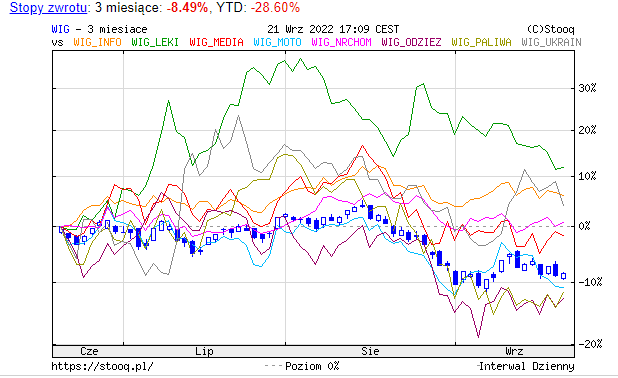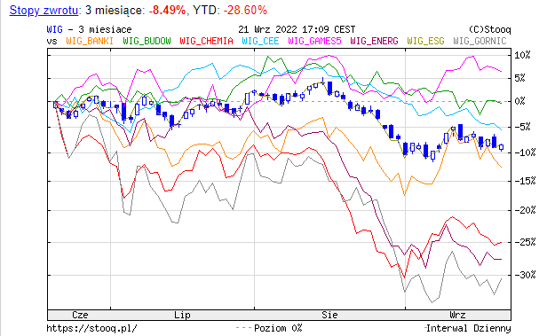 W tym okresie powyżej zera trzymała się informatyka, leki, nieruchomości, media, gry, Ukraina. Wykresy są z 21.09.2022, czyli sprzed paru dni, które nie odmieniły szczególnie sytuacji, a nawet po ostatnich planach Jacka Sasina o podatku od zysków nadzwyczajnych zasiały nowy pesymizm. większość z nich nie pokazuje jasnego trendu ku wzrostom, natomiast nie brakuje spadających głęboko, jak chemia, górnictwo czy odzież, z których część jeszcze w kwietniu budziło nieco nadziei.